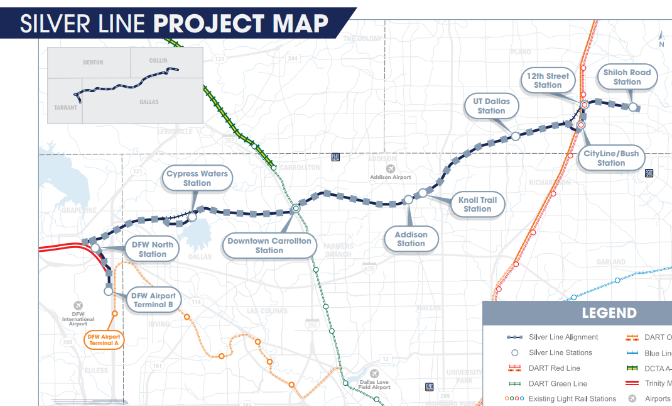 2025年後半から2026年開業予定とか見かけた気がします。この新線シルバーラインは、都心から放射状に出ている各線を横断する線になり、red lineのプレーノ付近より少し東からフォートワース空港に至るとのことです。