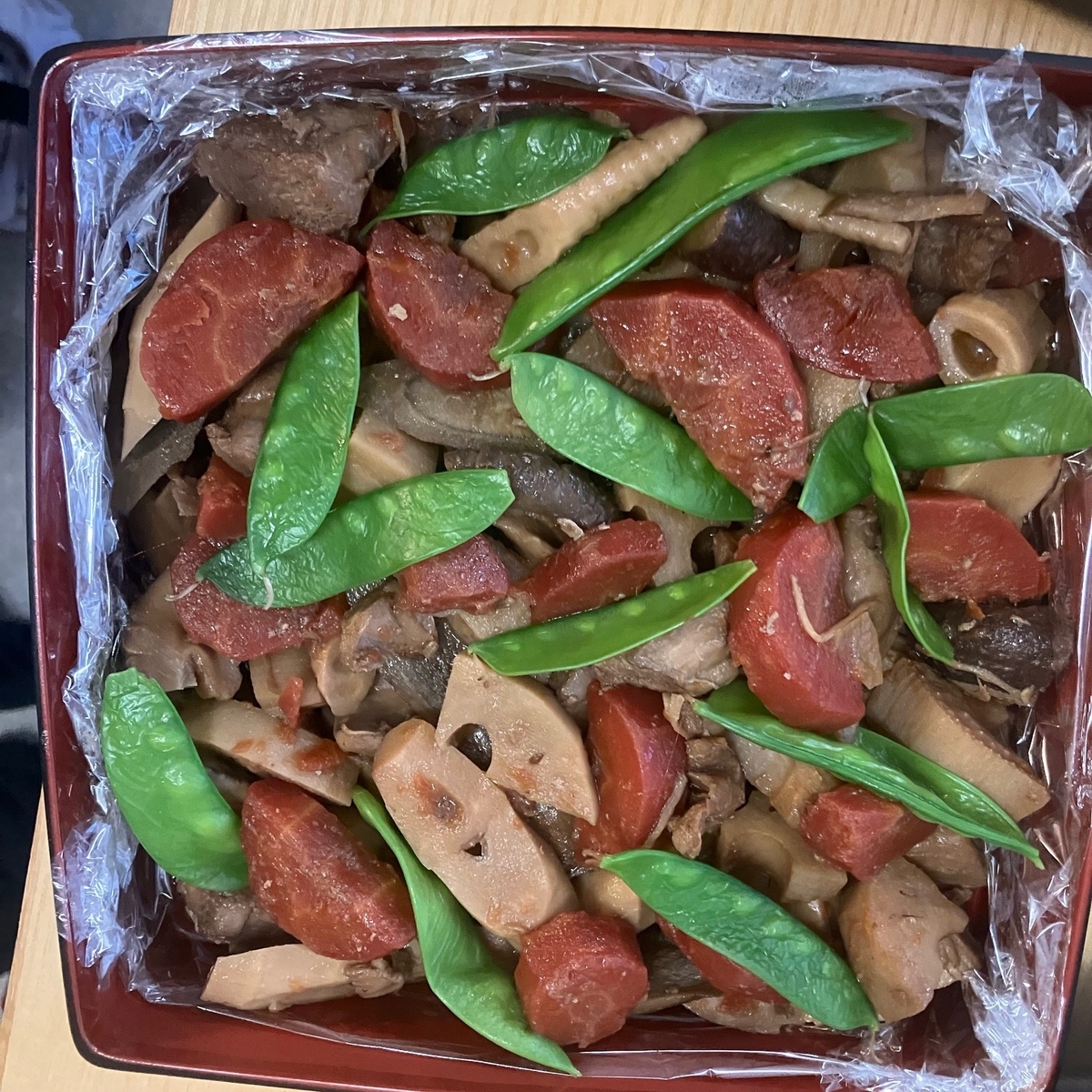 2つ目は、、盛り付けのお手本にしたSNSの画像では、一段まるっと筑前煮を詰めているのが多かったので、そのようにしましたが、温め直しを考えると、我が家の重箱はレンジ対応していないので、そのままでは温められません。せっかくシール蓋がついているのでそのまま冷蔵庫にいれられるのに、その点がもったいないです。