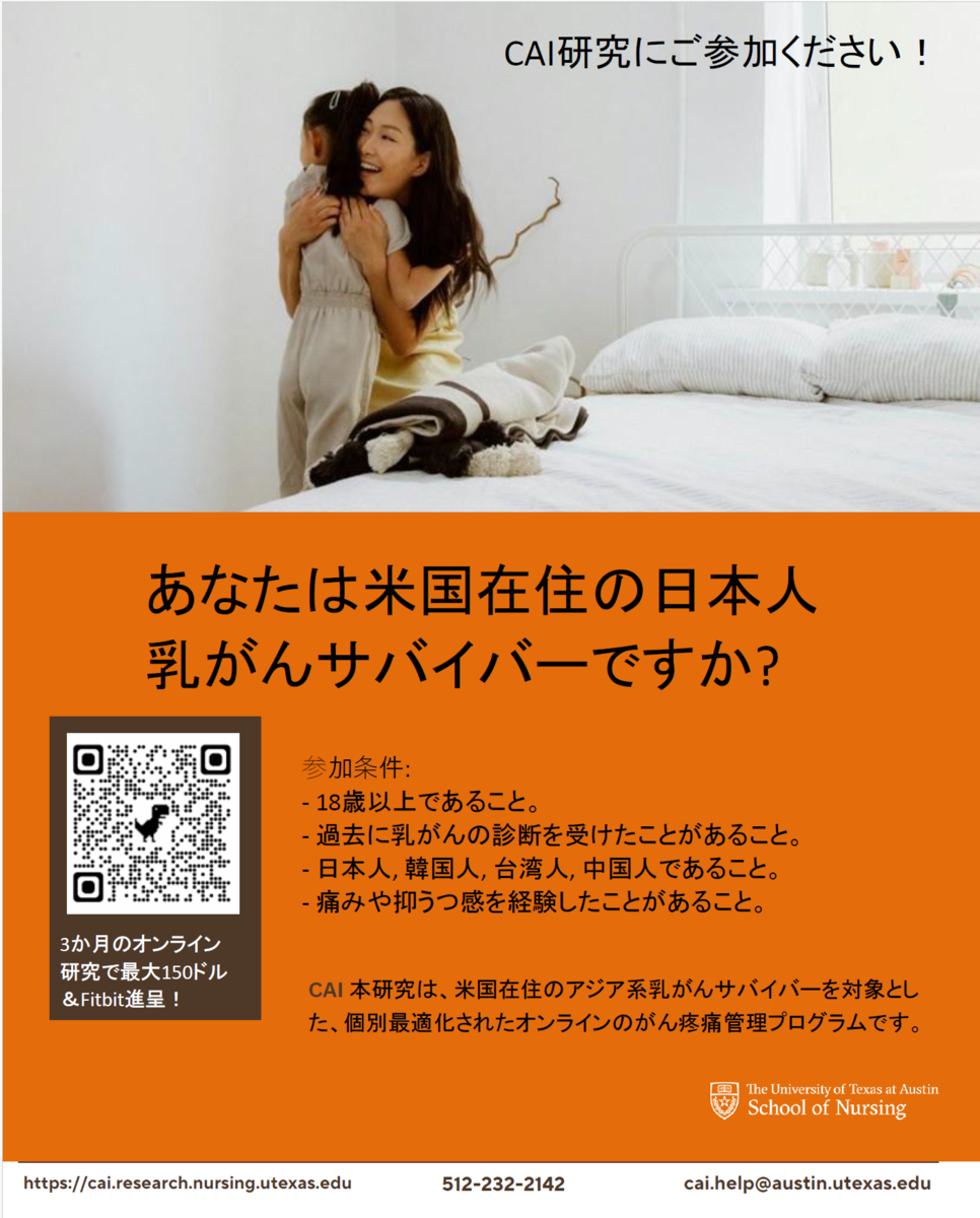 テキサス大学オースティン校の研究チームでは、アメリカにお住まいの日本人女性乳がんサバイバーの方を対象に、オンライン疼痛マネジメント支援プログラムに関する研究を行っております。